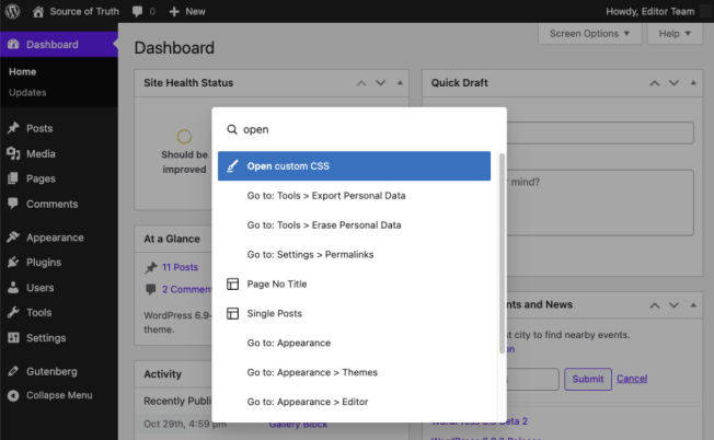 • Dashboard-wide Command Palette: The Command Palette will help users streamline their workflow across WordPress Admin pages.